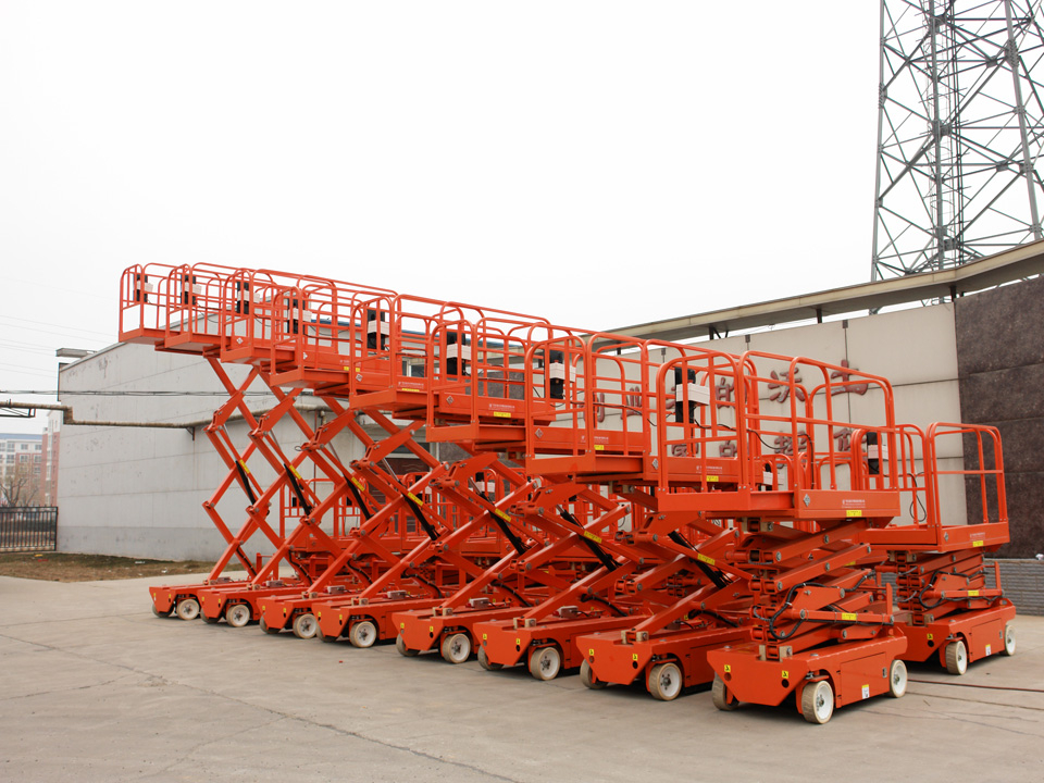 剪叉自行走式升降平臺,機(jī)動性強(qiáng),工作范圍大,如公路交通、路燈照明、工程搶險等。它的動力可以使用汽車發(fā)動機(jī)或者直流電池、使用安全可靠。